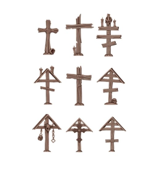 Recreate a somber and narrative atmosphere in your scenes and bases with these rustic, weathered wooden crosses. Ideal for cemeteries, forgotten battlefields, abandoned villages, or lands marked by faith and superstition. Perfect for armies and settings with a dark, historical, or Fantasy Background.