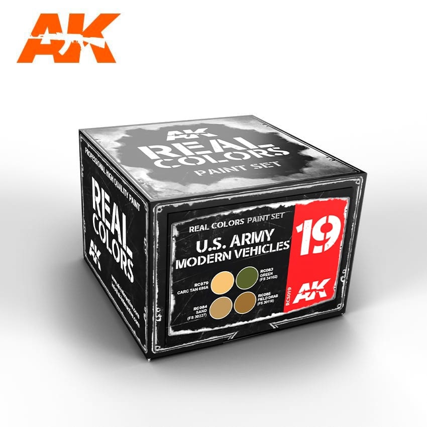 This set contains the four colors that are essential for painting models of vehicles used by the US Army from 1980s until today. Our Real Colors are the highest quality acrylic lacquer paints, made from an improved chemical formula over other brands in the market. They spray smoothly through an airbrush; adhere to the surface and dry perfectly with a soft matt finish. These paints hold firmly all kind of weathering products. They may be diluted with AK-Interactive’s specific thinner, or thinners from other manufacturers intended for acrylic lacquer paints (non-vinyl). They may also be easily mixed with other acrylic lacquer paints. Real Colors accurately reproduce the original colors.