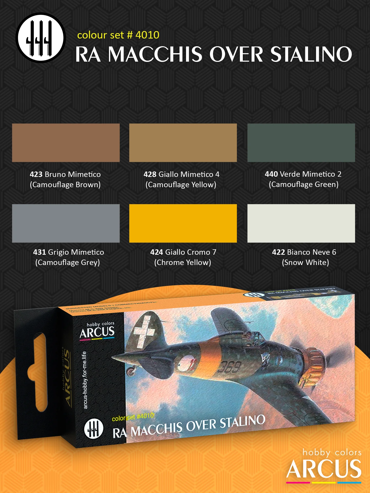 The "RA MACCHIS OVER STALINO" set consists of paints selected for the WWII Machi fighters of the Regia Aeronautica