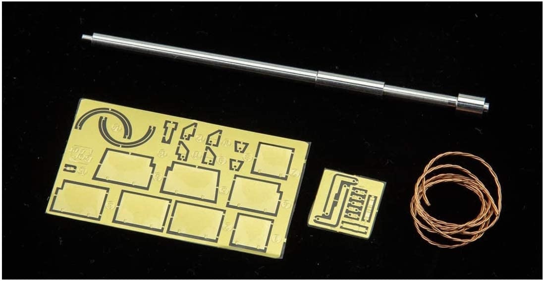 Bausatz wird geliefert mit gedrehtem Aluminium-Rohr, Foto-Ätzteilen, Drahtseil und segmentierten Ketten. Luken wahlweise offen, oder geschlossen darstellbar.