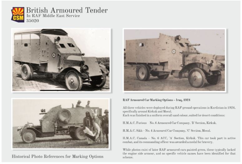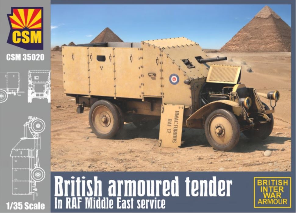 Highly detailed plastic injection model kit representing the British Armoured Tender as used by the RAF Armoured Car Companies in the Middle East during the 1920s. These vehicles served in operations across Iraq and Kurdistan, performing patrol, escort, and security duties in challenging desert conditions.