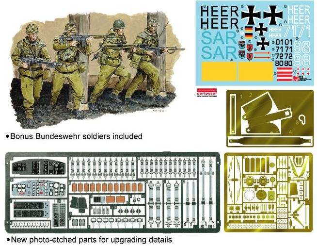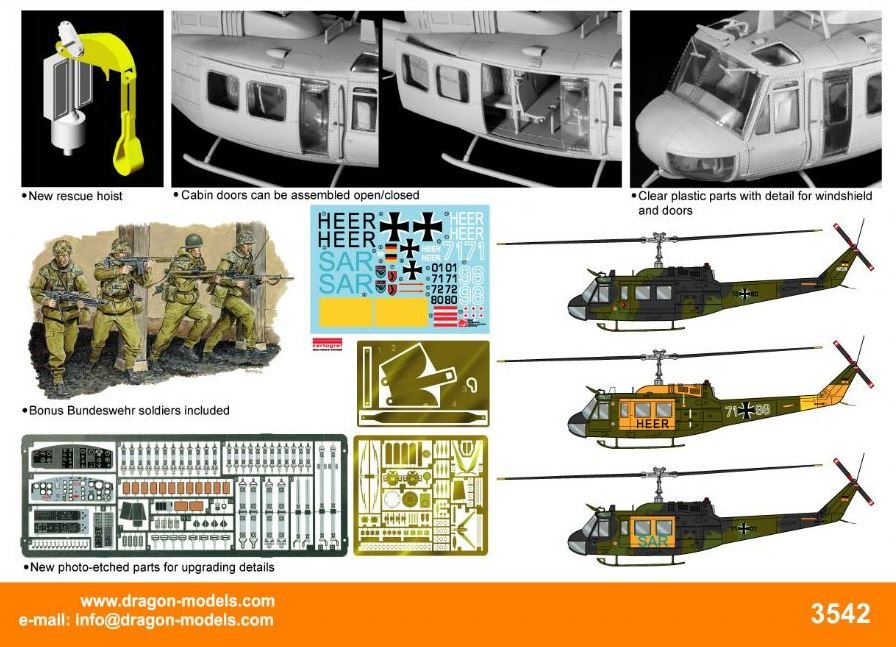 Hot on the heels (or should that be tail rotor blades?) of Dragon’s 1/35 scale UH-1D Huey, another model helicopter version has been announced. It is a 1/35 scale UH-1H of the German Heer (Army). As before, this kit is packed with exciting detail and components, including photo-etched parts to upgrade both the interior and exterior. Some of these photo-etched pieces are even pre-painted for extra modeling convenience. The cabin doors can be modeled open or closed, allowing all the spectacular interior detail to be displayed. A special piece of equipment installed in the cabin is a rescue hoist, which is replicated in a detailed resin casting. As a special bonus, this German helicopter from Dragon comes with a set of four German paratrooper figures. These action figures create instant diorama possibilities as this elite unit springs into action!