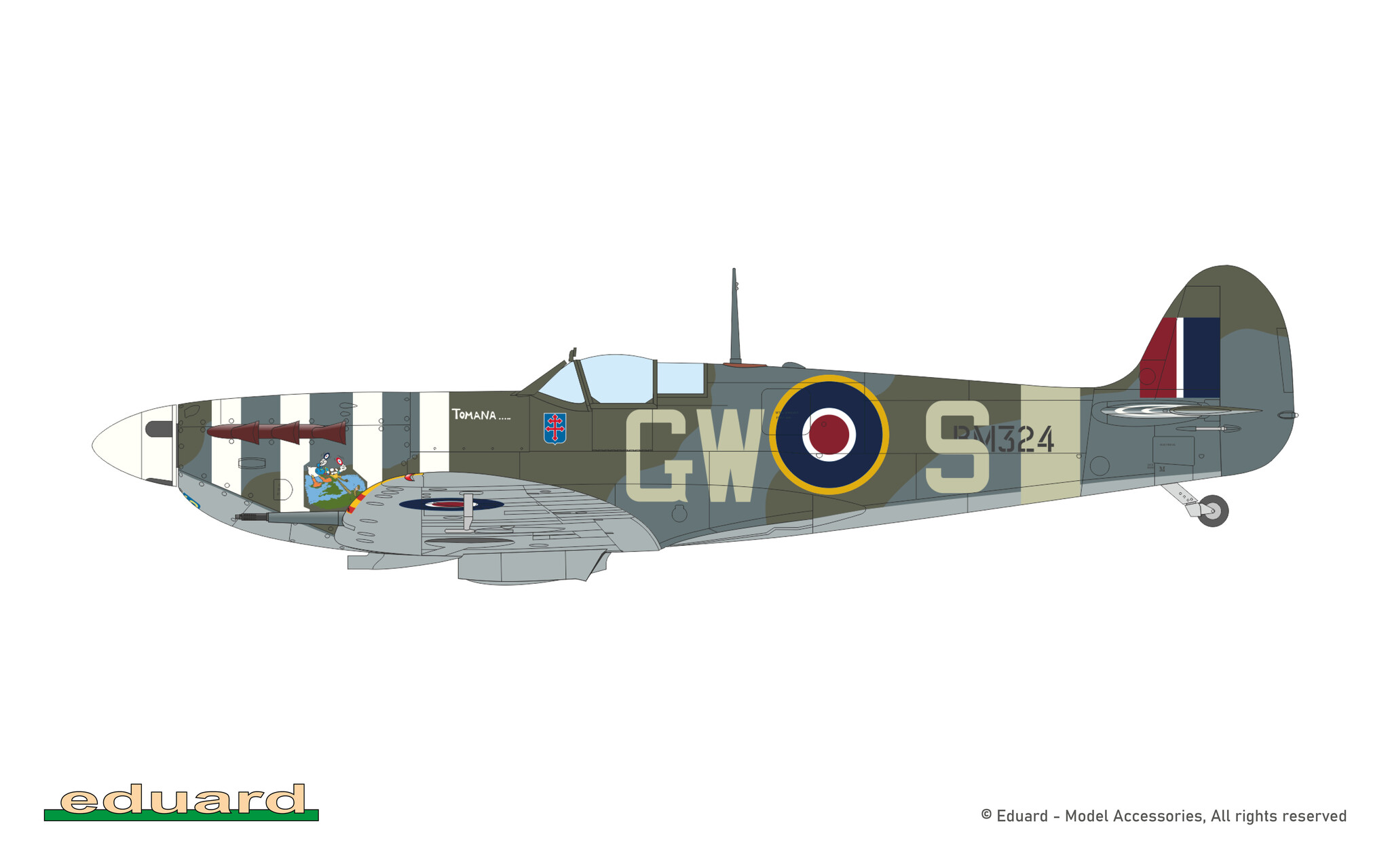 From the kit you can build Spitfires of pilots of different nationalities flying in the RAF fighting over the occupied west part of Europe.