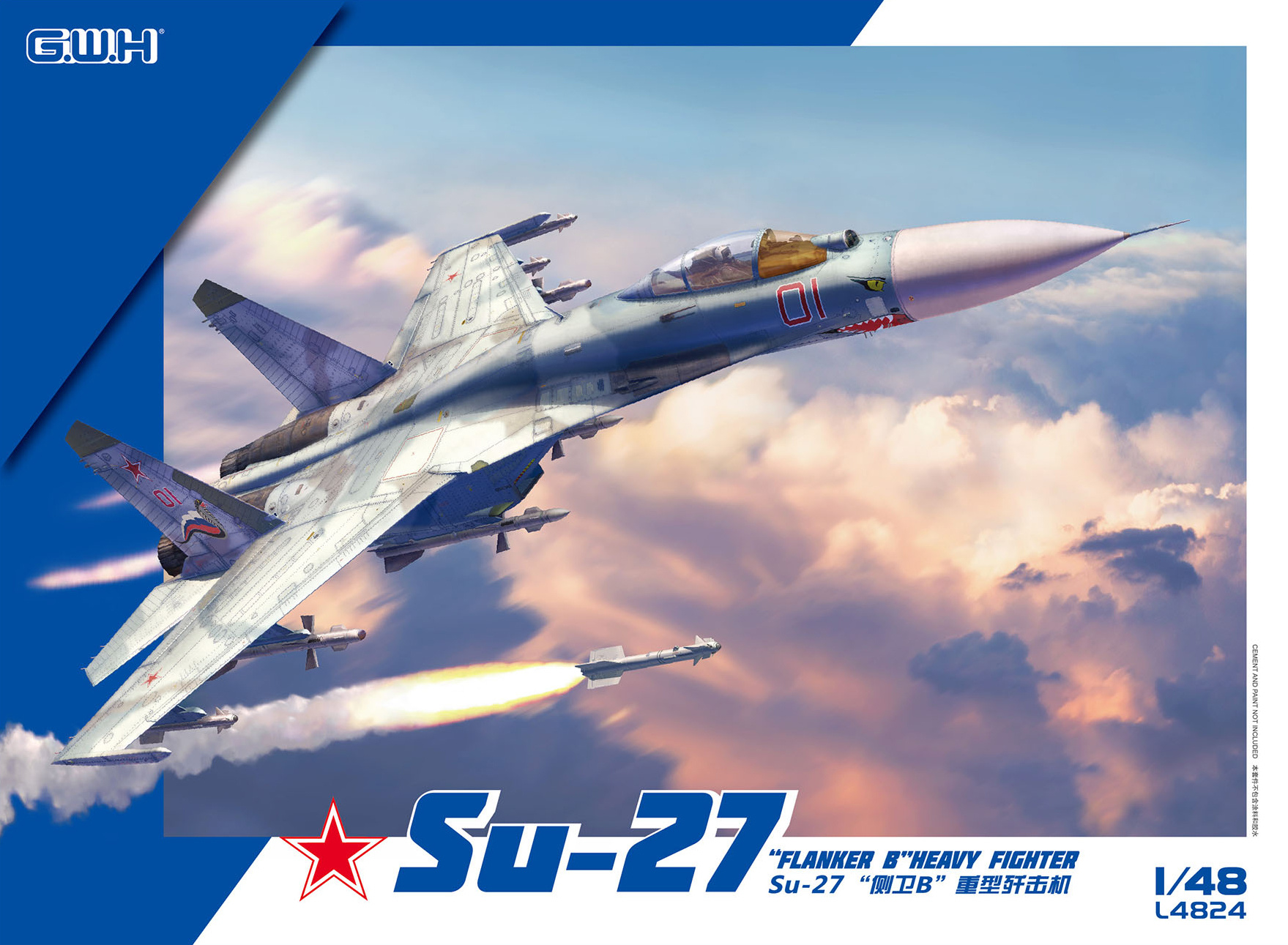 Great Wall Hobby (through Pit-Road) brings us their kit of the single-seat Su-27 Flanker B! The main wing front edge slats, flaps, and horizontal stabilizer can all be built lowered or raised; the nose radome can be built opened or closed. The air brake can also be built opened or closed. Photo-etched parts such as the head-up display are included, as are decals for six versions (one each for the Russian Naval Aviation Corps, Russian Air Force, Soviet Air Force, Ukrainian Air Force, and two for the Chinese Air Force).