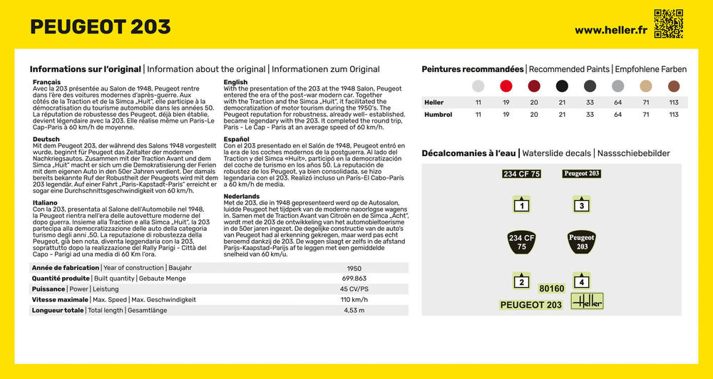 Mit dem Peugeot 203, der während des Salons 1948 vorgestellt wurde, beginnt für Peugeot das Zeitalter der modernen Nachkriegsautos. Zusammen mit der Traction Avant und dem Simca „Huit“ macht er sich um die Demokratisierung der Ferien mit dem eigenen Auto in den 50er Jahren verdient. Der damals bereits bekannte Ruf der Robustheit der Peugeots wird mit dem 203 legendär. Auf einer Fahrt „Paris-Kapstadt-Paris“ erreicht er sogar eine Durchschnittsgeschwindigkeit von 60 km/h.
