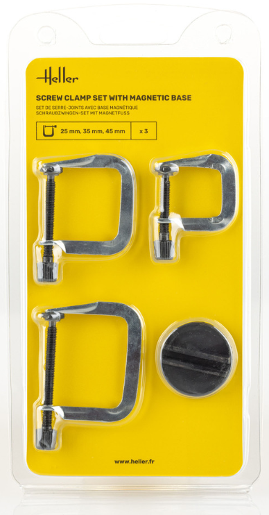 Schraubzwingen-Set mit Kunststoffgriffen für präzise Arbeiten. Mit Magnetfuß als Mini-Schraubstock zu verwenden. Enthaltene Größen: 20 mm, 30 mm und 35 mm.