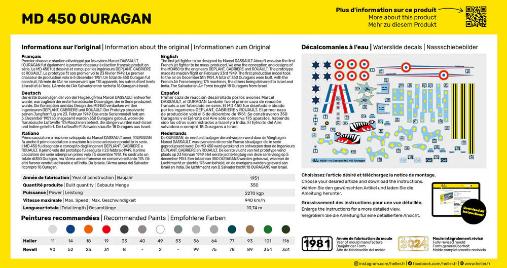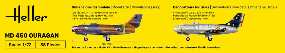 Der erste Düsenjäger, der von der Flugzeugfi rma Marcel DASSAULT entworfen wurde, war zugleich der erste französische Düsenjäger, der in Serie produziert wurde. Die Konzeption und das Design des MD450 verdanken wir den Ingenieuren DEPLANT, CABRIERE und ROUAULT. Der Prototyp absolvierte seinen Jungfernfl ug am 23. Februar 1949. Das erste Serienmodell hob am 5. Dezember 1951 ab. Insgesamt wurden 350 Ouragans gebaut, wobei die französische Luftwaffe 175 Maschinen behielt, die übrigen wurden nach Israel und Indien geliefert. Die Luftwaffe El Salvadors kaufte 18 Ouragans aus Israel.