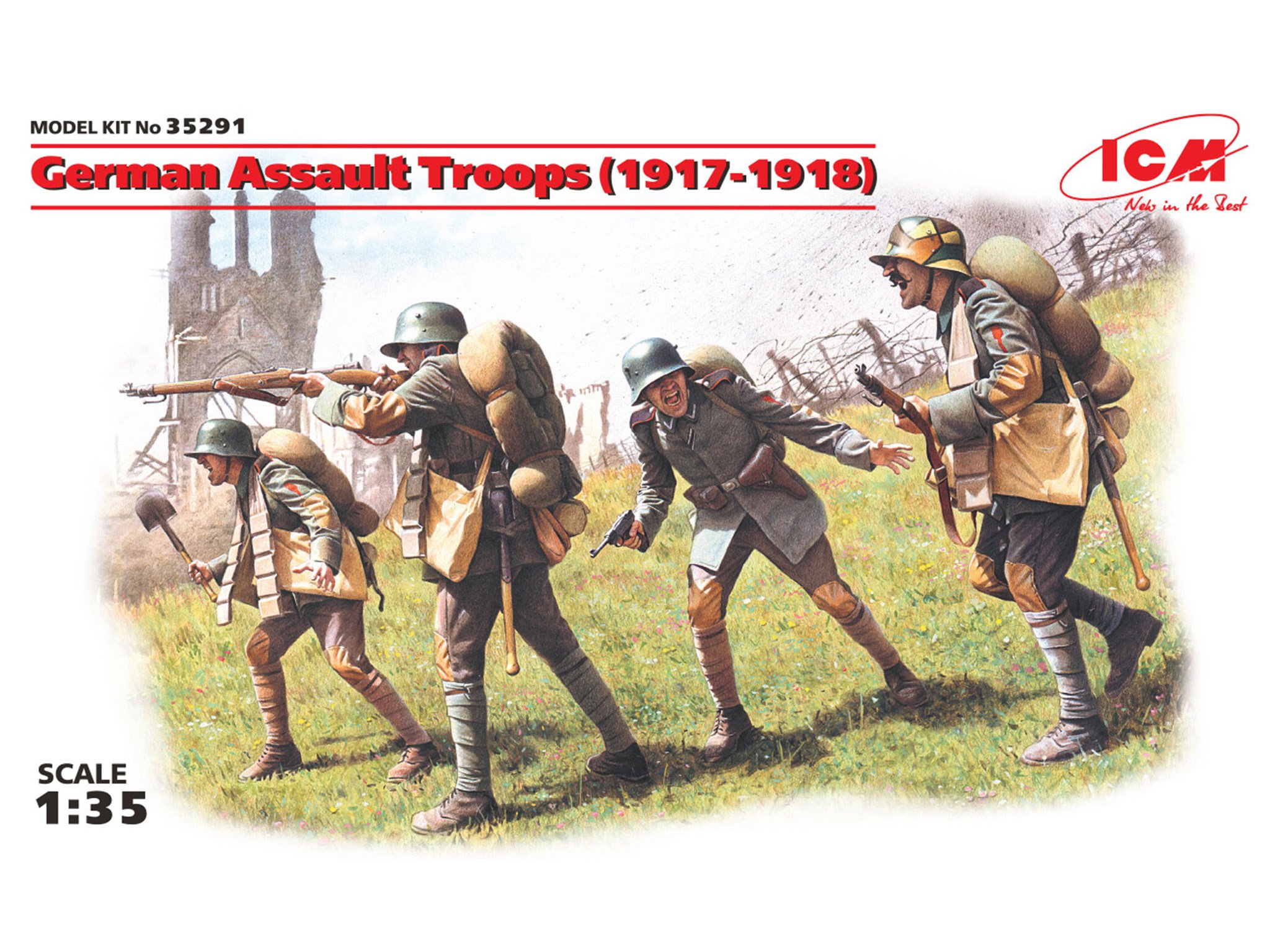 The kit includes four figures – one under-officer and three soldiers of WWI German assault troops.