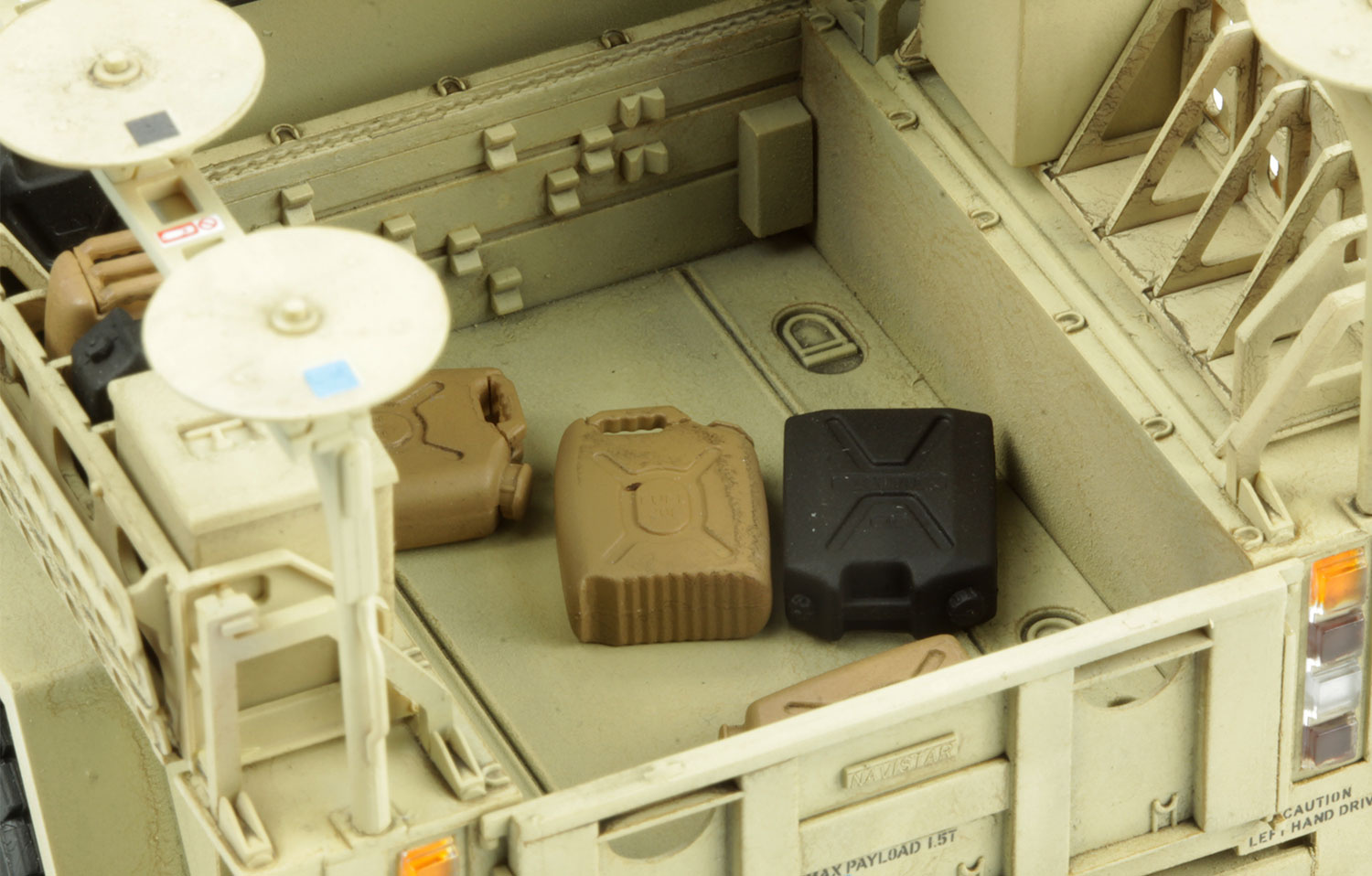 This VS-009 British Army Husky TSV (Tactical Support Vehicle) plastic model kit has a total of 320 parts. This kit features perfectly reproduced crew compartment interiors. Doors can be built open or closed. The roof weapon station is rotatable. Front wheels are steerable. Clear glass parts are included and precision PE parts are included.