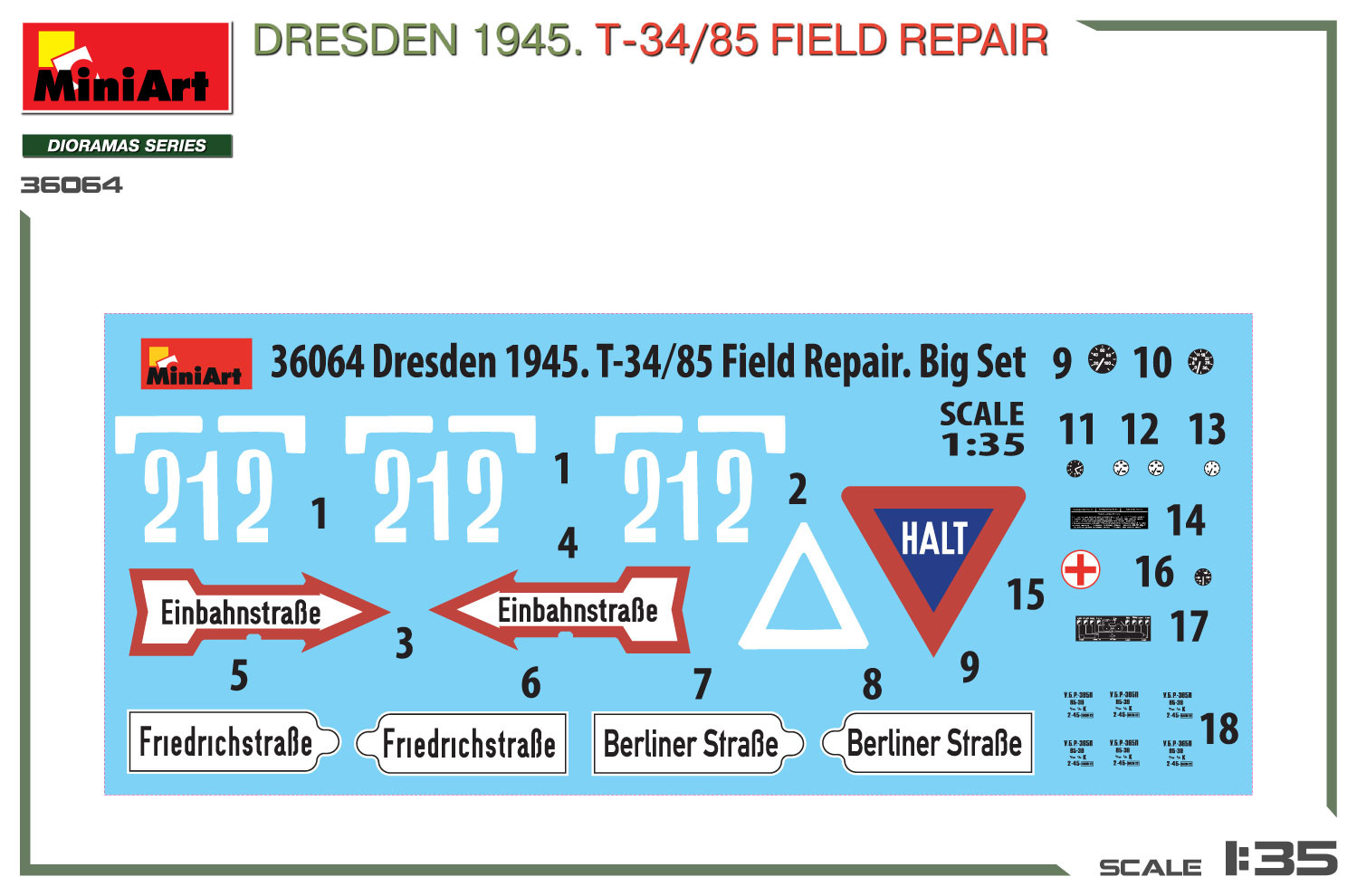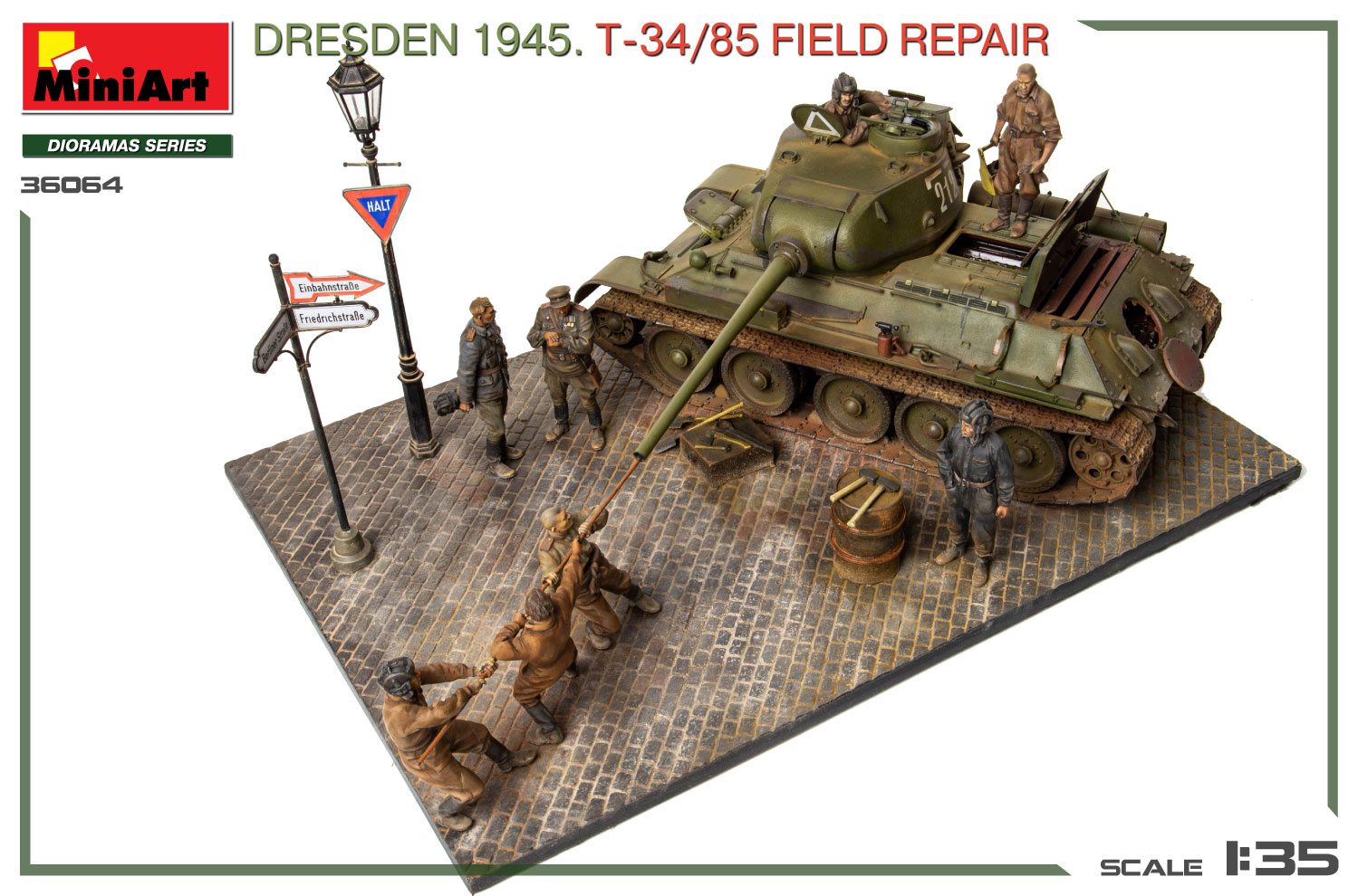 A complete diorama set depicting a Soviet T-34/85 undergoing a field barrel replacement in the final days of the war in Germany.