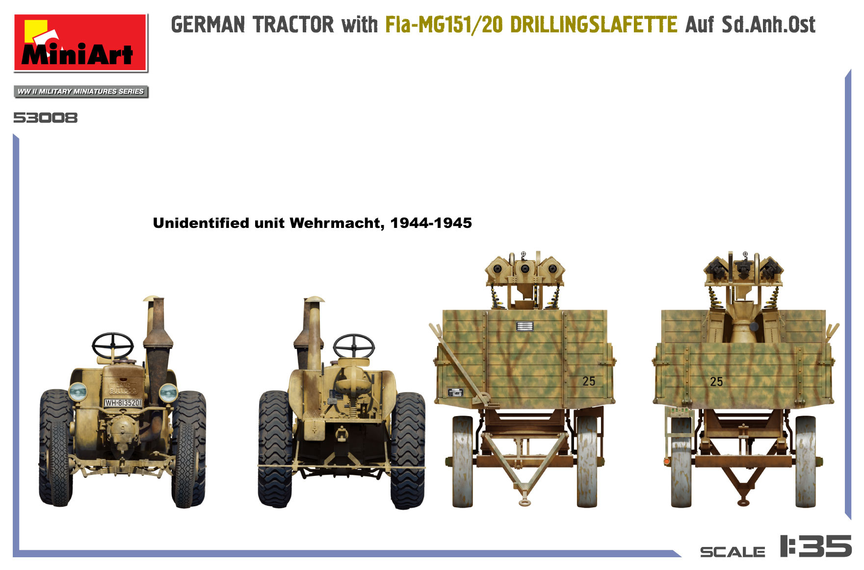 This detailed set features a Lanz Bulldog tractor paired with a Sonderanhänger Ost trailer equipped with a triple Fla-MG151/20 anti-aircraft mount. The kit includes finely reproduced vehicle details, the cannon assembly, and optional decal markings for different configurations. Perfect for creating unique World War II dioramas.