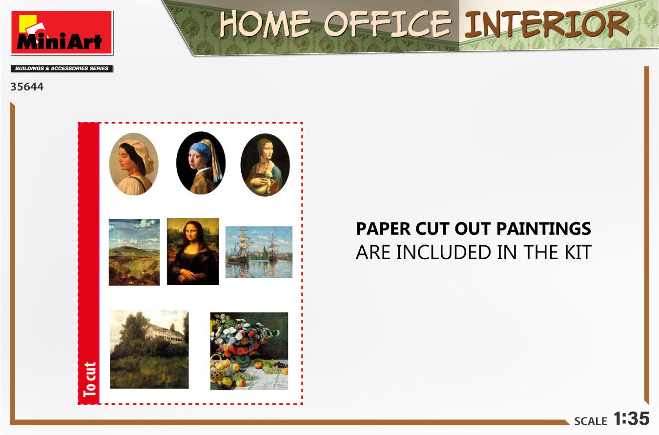 Kit contains models of furniture, phone, radio and framed paintings.Paper cut out paintings are included.