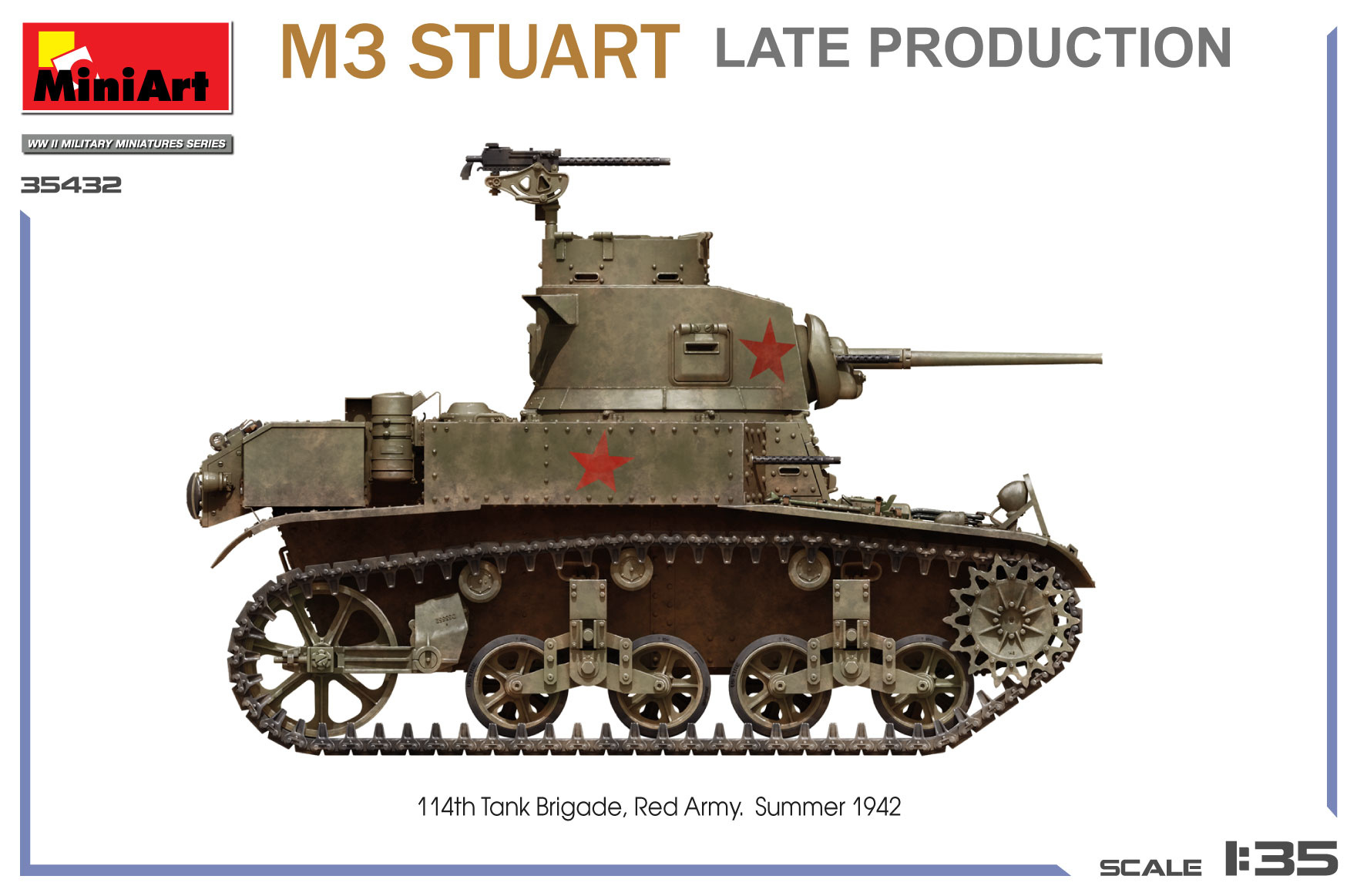 A detailed model of the late-production M3 Stuart—one of the most widely used Allied tanks of WWII. This version features upgraded hull details, additional fittings, and a wide range of markings for different theaters.