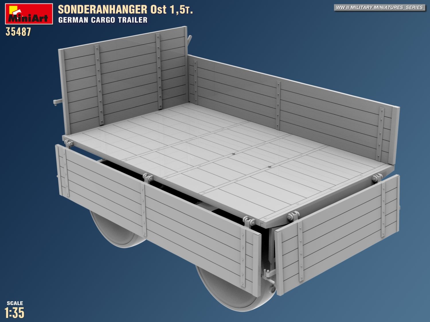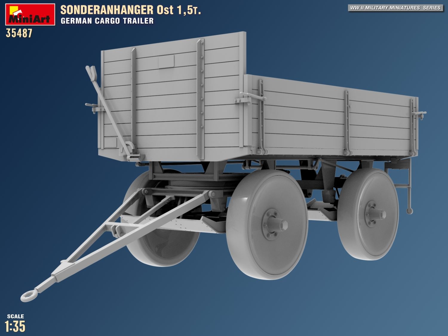 German cargo trailer widely used on the Eastern Front. This Scale 1:35 model accurately reproduces the Sonderanhänger Ost 1,5t., with attention to the wooden construction and wartime field camouflage.