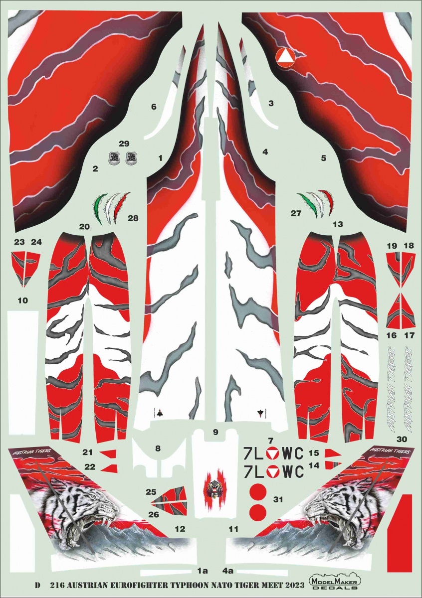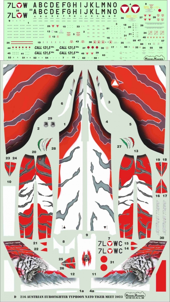 Austrian Tigers paint job for the plane Eurofighter Typhoon in the NATO Tiger Meet 2023 version. The set includes all of the necessary components including stencils and a detailed instruction on how to apply the decals, the set was designed for Revell model kits in 1/48 scale. Decals were designed in cooperation with the original designer for the planes paint job and printed in the renowned Italian printing house Cartograf.