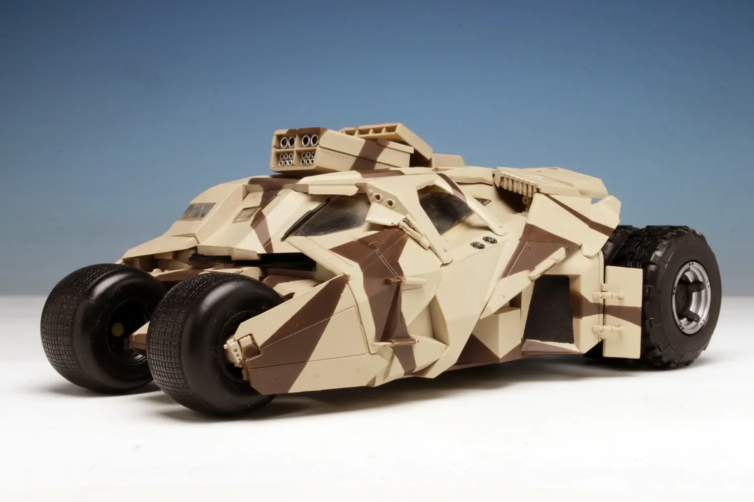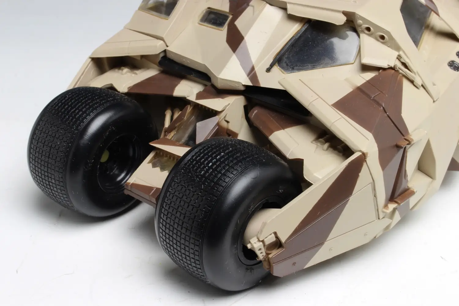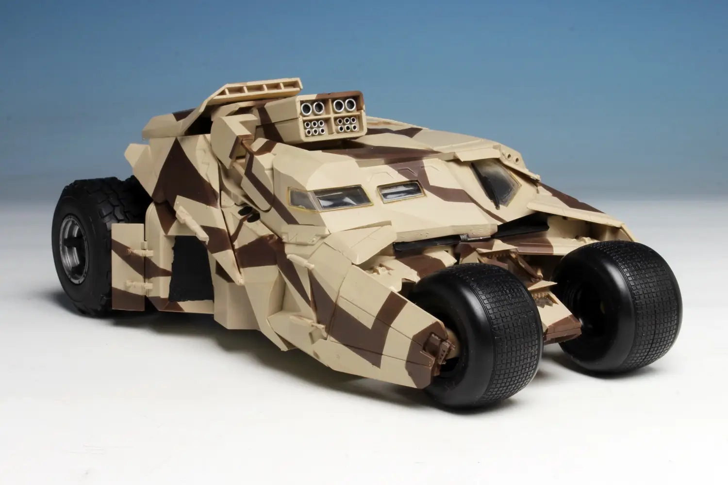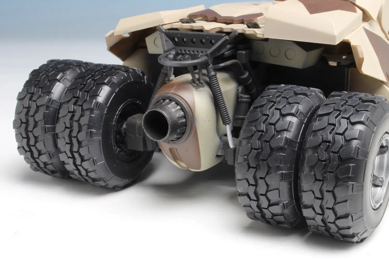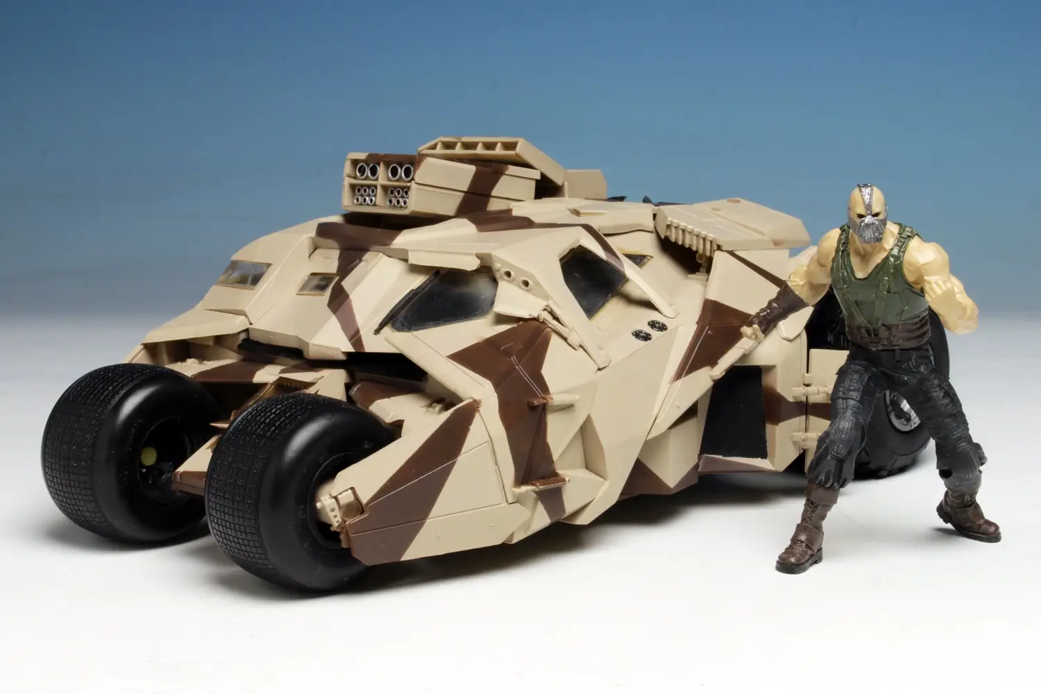 From the third Dark Knight film, the armored Tumblers were taken over by Bane's men to control Gotham City. Based on the standard Tumbler, these had a partially armored roof with a retractable rocket launcher. Resin Bane figure included. Requires paint and glue for final assembly.