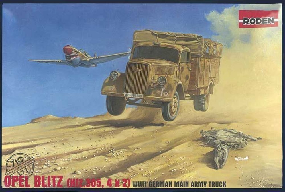 Opel "Blitz" (Kfz.305) (4 x 2) During World War Two the German Army adopted and intensively used many types of cargo truck, but without doubt the three-tone Opel "Blitz" was the most famous of all Wehrmacht vehicles. With more than 100,000 built, these trucks with the Bitz's characteristic lightning emblem on the radiator front panel became symbolic of Germany's conquests. Its tire tracks could be seen in the great city squares of Europe; in the fields of France and also in the endless sands of the African desert; and it even overcame the infamous Russian mud. These trucks had a reputation of hardiness and being easy to repair which made them a legend.