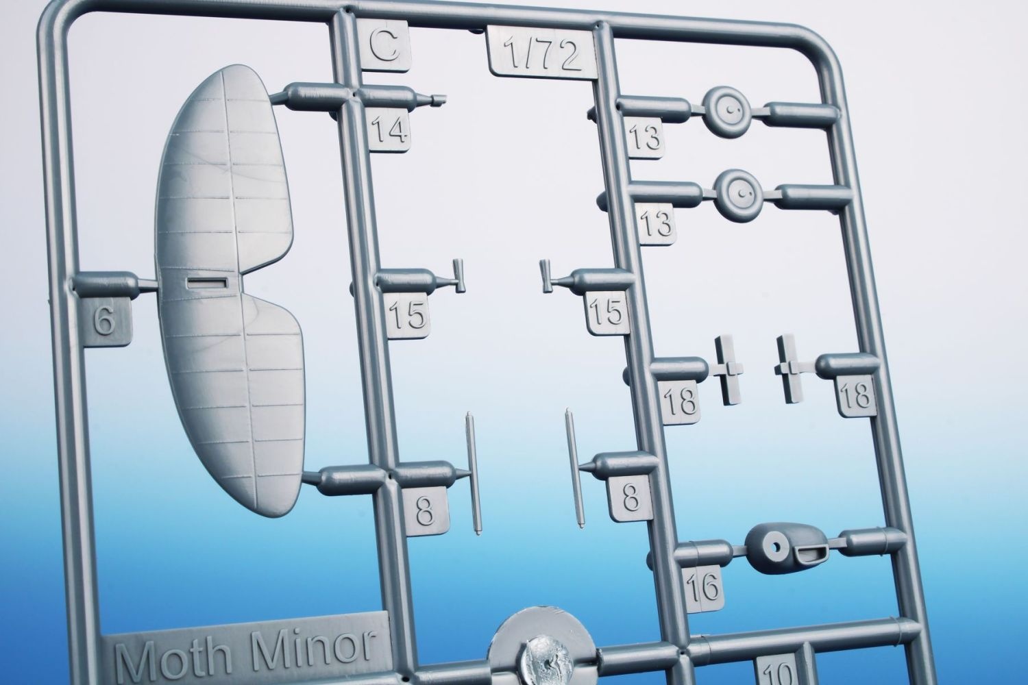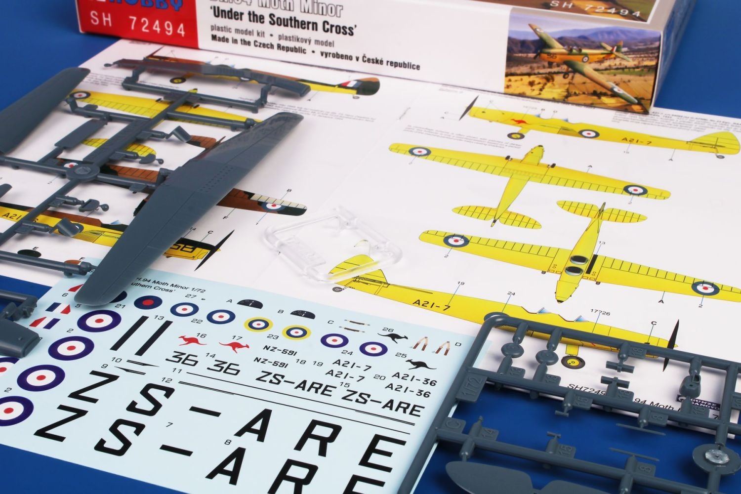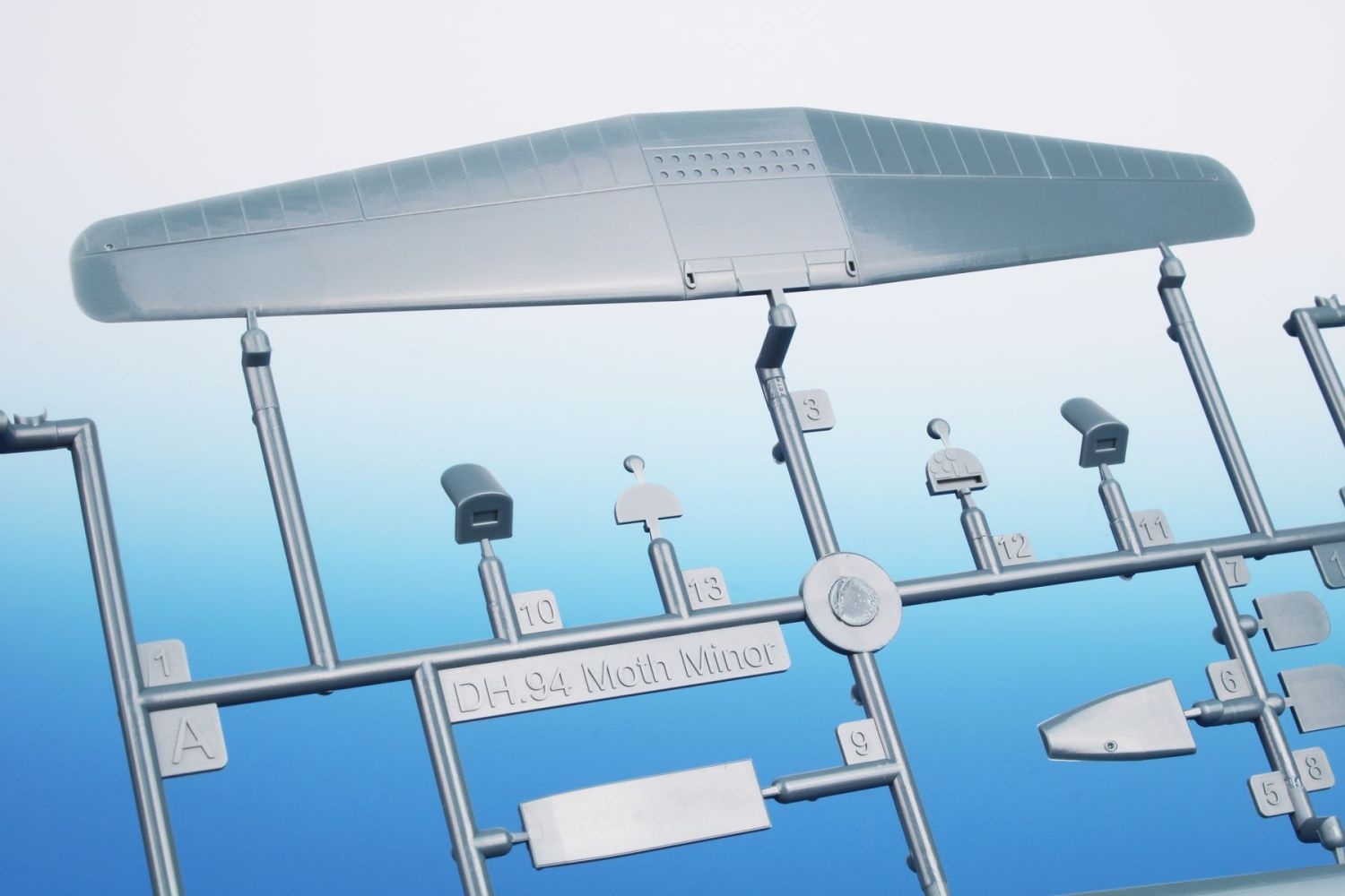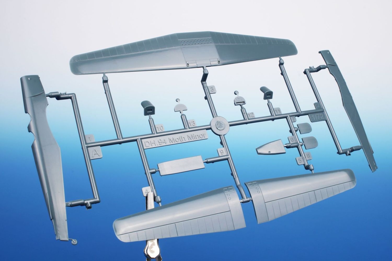 The Moth Minor model kit consists of two grey styrene sprues and a clear windshield parts sprue. Decals are offered for two RAAF machines, an RNZAF machine and a civilian machine from South Africa.