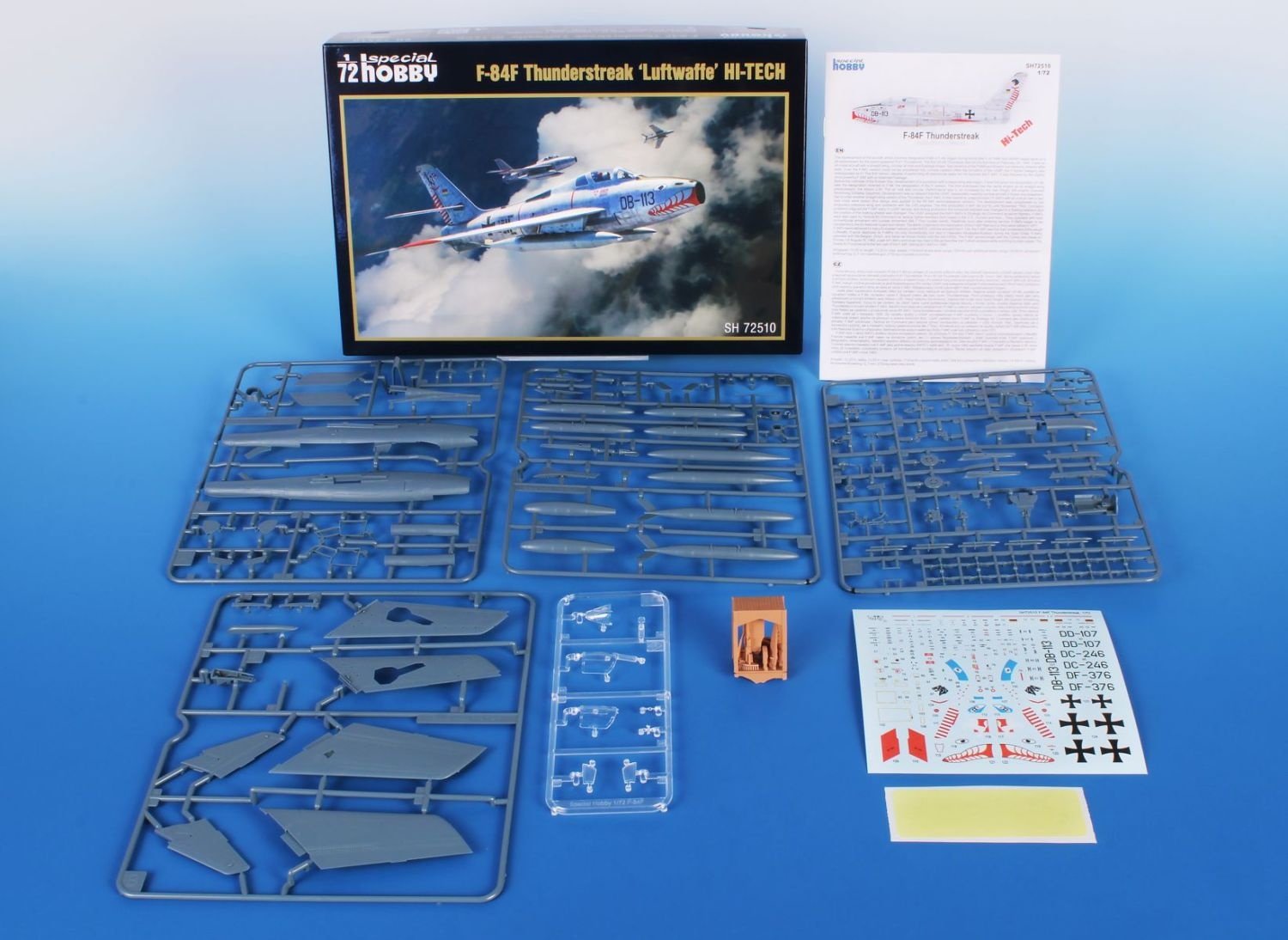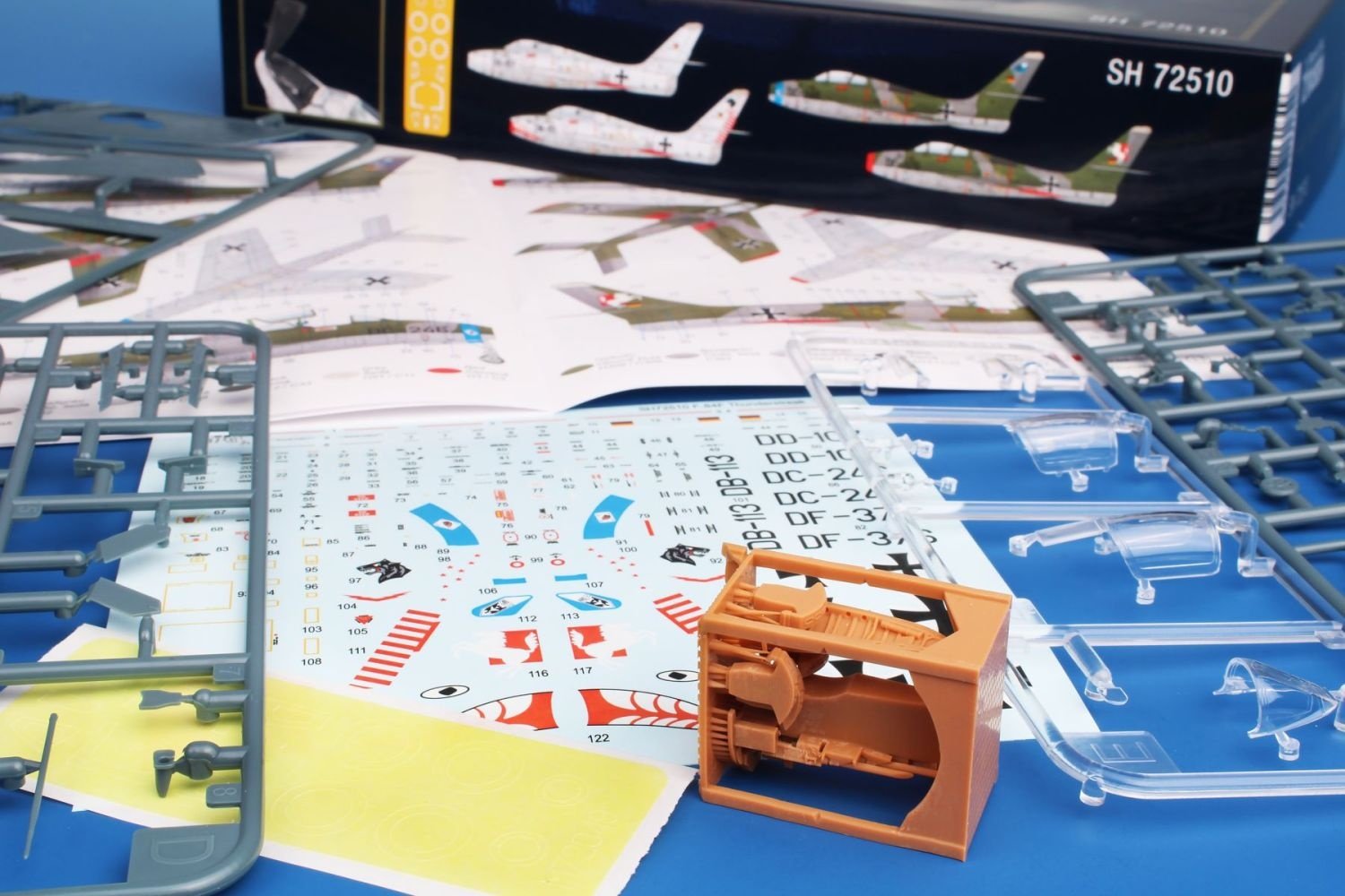 When the Luftwaffe F-84F Thunderstreak model had been first released this April, the release that contained a fragment from a real machine that crash landed on our territory, the speed of sales did take our breath away. And as we did not have more than a thousand of those fragments, there was left nothing to sell after less than a month's time. We still believe, though, that the F-84F in Luftwaffe livery will be widely seek after by many a modeller, and so we are going to release this SH72510 kit that replaces that really fast sold out SH72505. The sheet of decals and boxart are left the same, now it includes a pre-cut mask as well as a set of 3D-printed parts enabling the builder to have the nose machine gun compartment open.