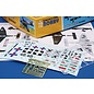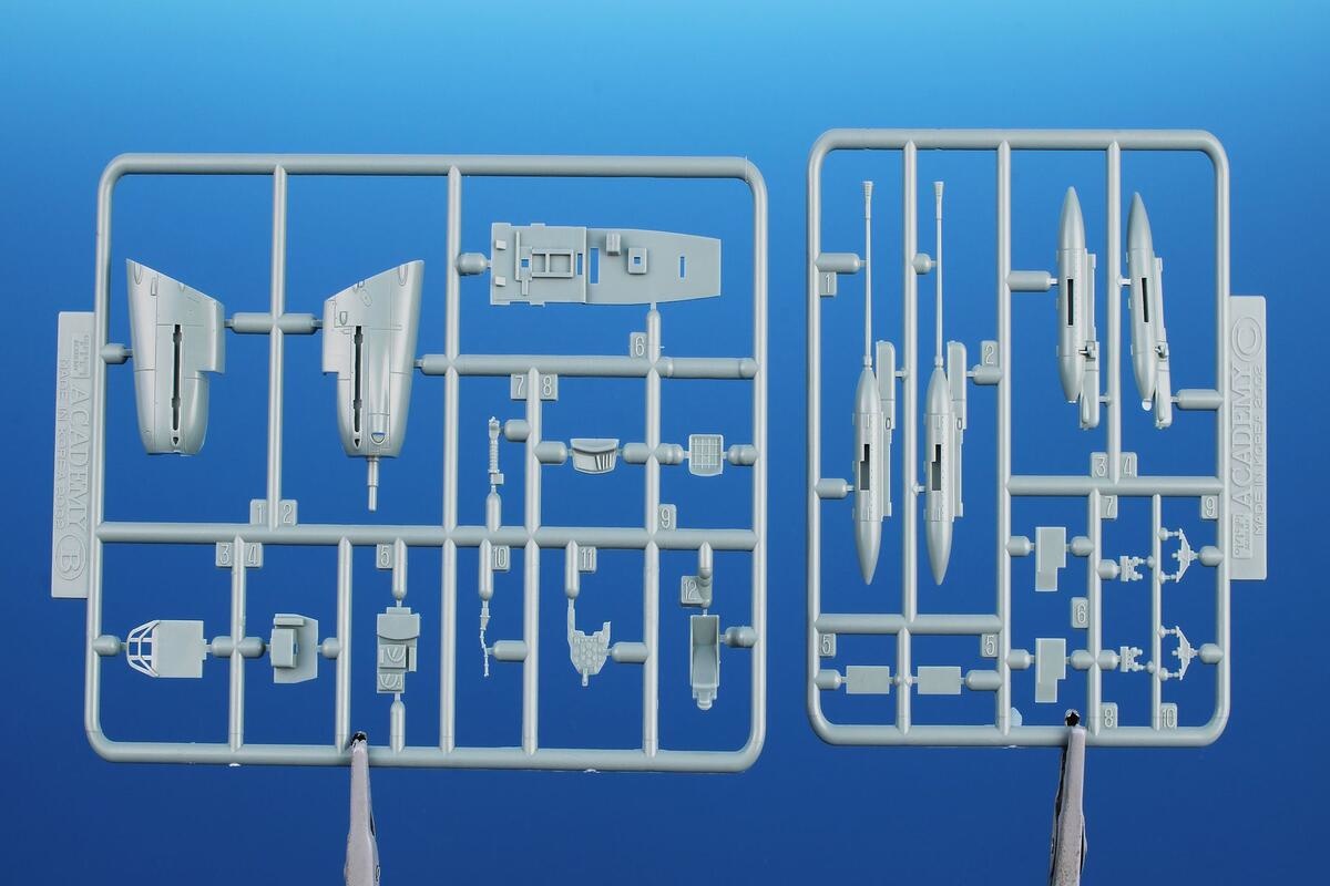 Our model brings no less than four schemes of machines flying over north Africa. Various schemes have been picked up to show how colourful and eye-catching the machines in desert colour might be. And to make the matter even more interesting to the modeller, one of the schemes feature the machine with one of its wings replaced with a new one in European style colours. The parts of the kit are laid out to two styrene sprues and a small one with clear parts. You can build the model with engine cowl and wing gun panels removed, with the wing flaps down and slats in the open position.