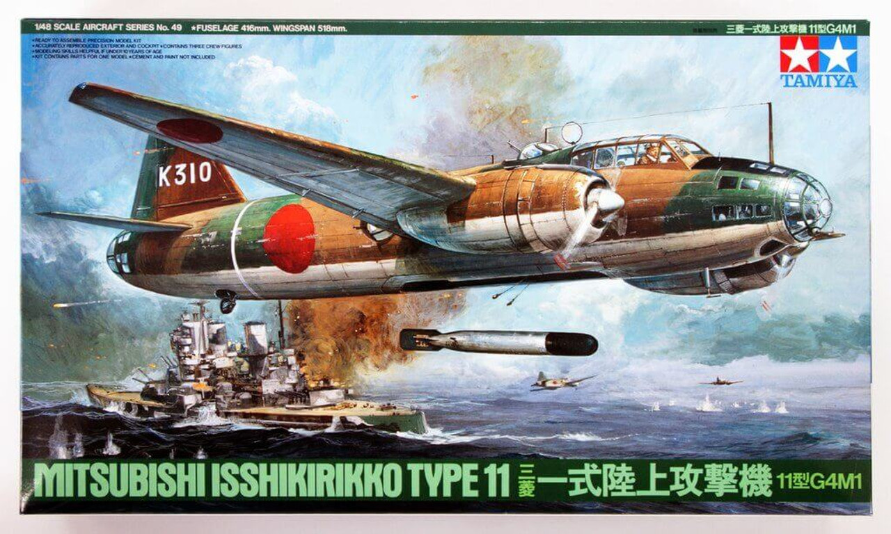 The "Isshiki Rikujō Kōgeki ki (Isshikirikkō)", or Type 1 Land-Based Attack Aircraft, was more widely known as the G4M (Allied reporting name "Betty"). It was widely used by the Japanese Navy during WWII, as was particularly notable for contributing to the sinking of the British battleship Prince of Wales and battlecruiser Repulse near the beginning of the war. This kit accurately reproduces the Model 11, or G4M1, variant of this bomber, including its rotund, cigar-shaped fuselage. The flaps, engine cowl flaps, dorsal gun position, and upper part of the front canopy can all be assembled in either open or closed positions. Parts for a Type 91 torpedo, twelve 60kg bombs, and three crew figures, as well as six marking options are also included.