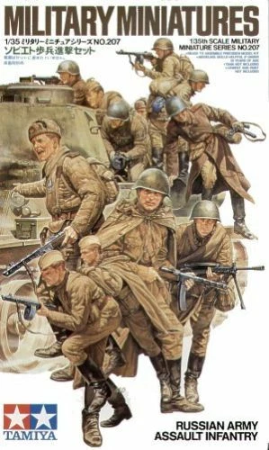 This is a 1/35 scale plastic assembly model set of a Russian Army Assault Infantry unit which protected Mother Russia against the invading German forces during WWII. This set includes 12 figures in different poses such as a commander pointing and giving instructions, as well as soldiers shooting from up above and jumping off a tank. Uniforms depict those worn at the Kursk front from 1943 through to the end of the war. The PPsh-41 submachine gun also known as the "Mandolin" and the Degtyaryov light machine gun both feature a sharp finish.