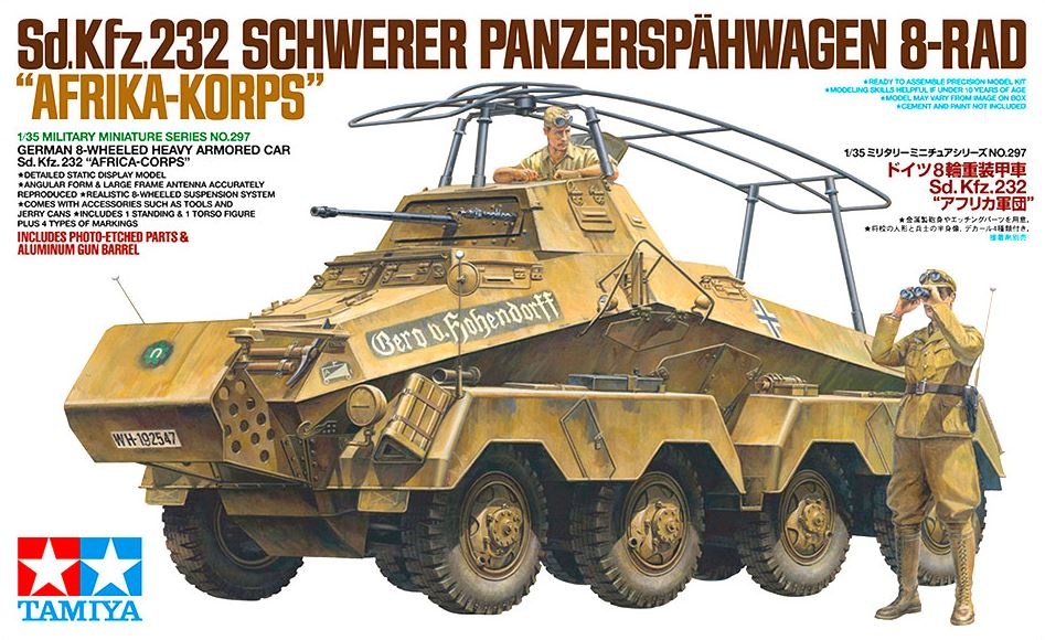 During the first half of WWII, German reconnaissance units greatly used the Sd.Kfz.231 series Heavy Armored Car. Above all, the Sd.Kfz.232 was equipped with a long distance wireless radio also having a unique large-sized frame antenna. It also came armed with a 2cm main gun and a MG34 machine gun mounted on its turret. The 8-wheeled Sk.Kfz.232 had an on-road top speed of 90km/h, featured elaborate front and rear driving positions, and a superb 8-wheel drive system. Because of the Sd.Kfz.232's excellent design and maneuverability, it came in very handy serving as the eyes of the German Army throughout Europe, Russia, and especially showed its full potential in the vast North African deserts.
