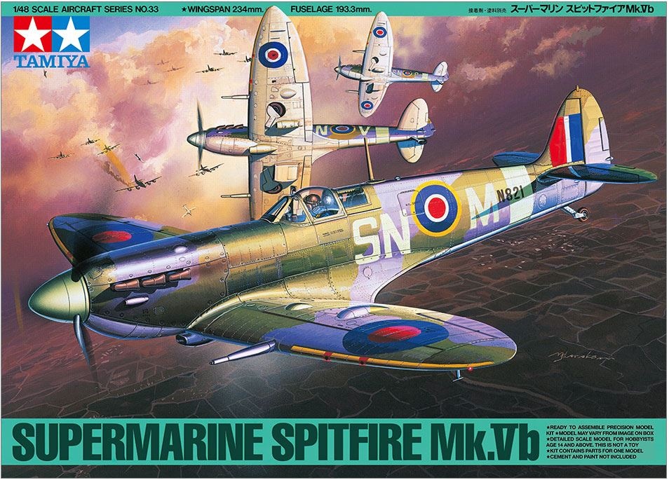 Powered by the Rolls-Royce Merin 45 engine, the Mk.Vb variant of the Spitfire was the mainstay fighter of the RAF in the middle stages of WWII. This 1/48 scale kit accurately reproduces this 20mm cannon-armed variant and includes options such as two different types of windscreens, three types of canopies, and both normal and clipped wingtips. One pilot figure and three marking options are also included.