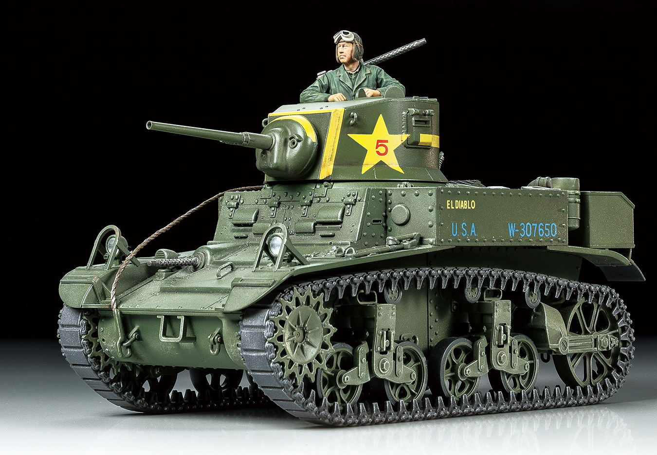 Das Standmodell ist eine Nachempfindung des US M3 Stuart, welcher ab März 1943 hergestellt und nicht nur von den US- Streitkräften verwendet wurde. Diesen Panzer gab es beispielsweise auch für die sowjetischen Streitkräfte. Die späte Produktionsvariante dieses Panzers hatte ein abgerundetes Turmdesign, bei welchem die Kuppel nicht vorhanden war. Die TAMIYA Modellbaukastenversion besticht durch hohe Passgenauigkeit als auch durch eine hohe Detailtreue.